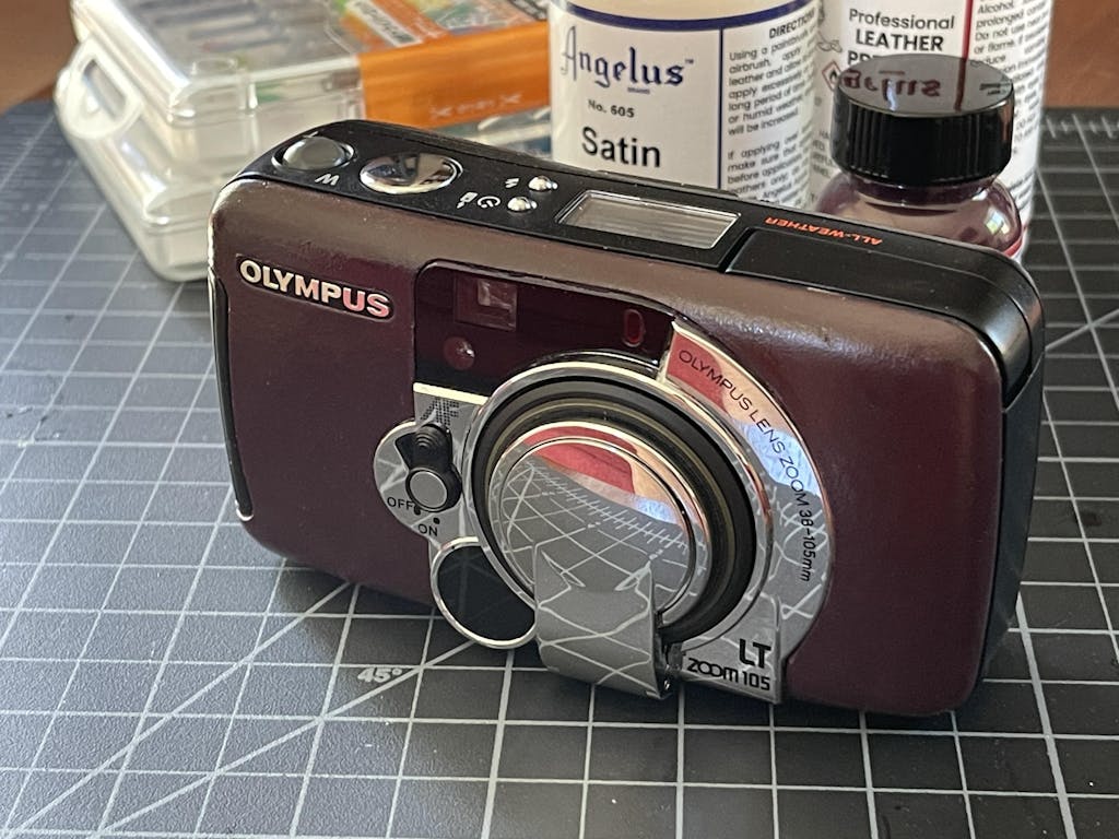 I used this to refinish a vintage Olympus LT Zoom 105 film camera which also has burgundy "leather" coverage. Surprisingly, it is a perfect match. I removed the old paint using Angelus preparer and deglazer (after taping it up carefully). Apply 2 coats of paint and then follow by 2-3 thin coats of Satin finisher. Now the 30 year old camera looks like new!